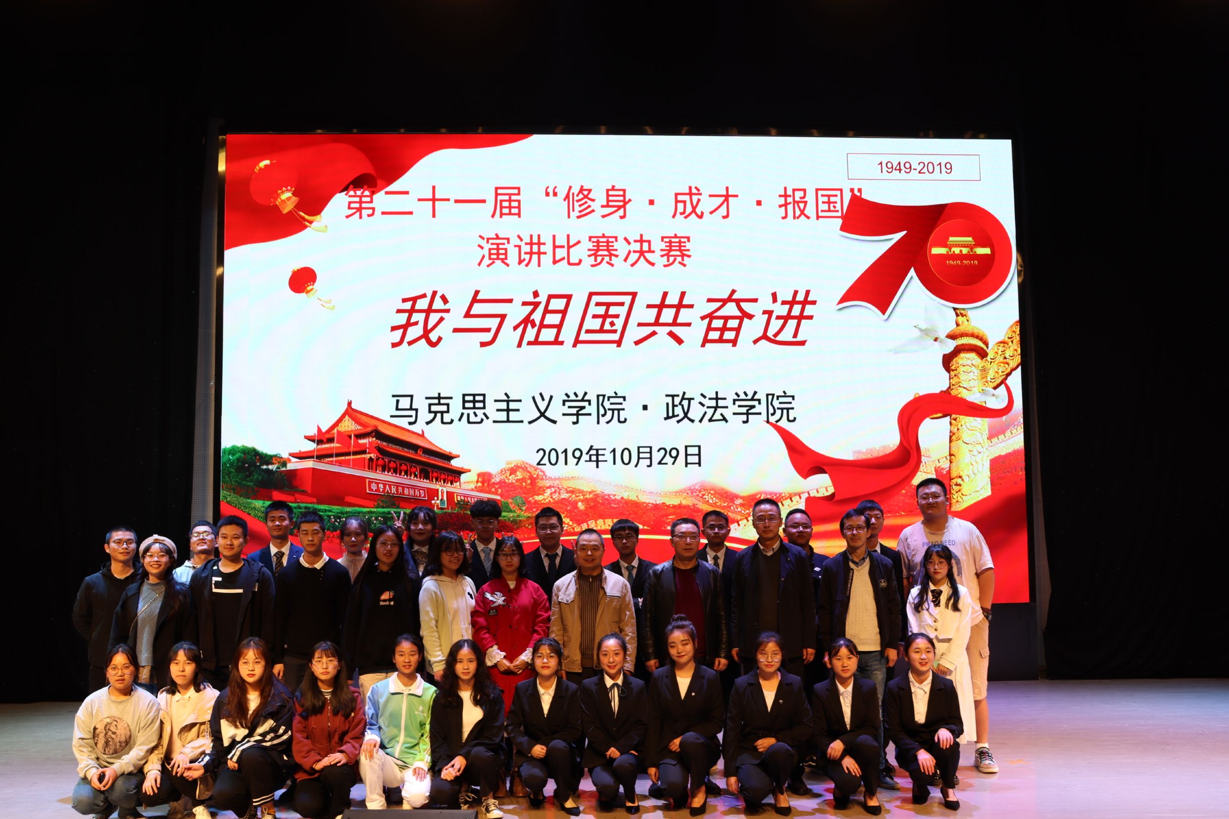 10月29日晚,伟德国际官网在艺术传媒大楼多功能厅举办以“我与祖国共奋进”为主题的第二十一届“修身.成才.报国”演讲比赛决赛。党总支书记刘春辉、党总支副书记吴辉兵、学工办主任唐幸福、辅导员曾亚、历史与纲要教研室主任王盟、优秀青年教师张岚、2017级优秀辩手蔡润禾担任评委,2018级、2019级学生到场观看比赛。