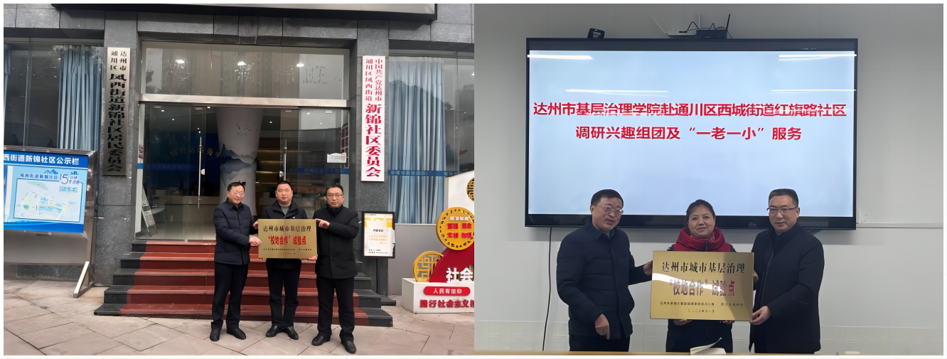 2024年1月8日,伟德国际英国党委书记刘春辉、院长孙杰一行赴通川区凤西街道新锦社区、西城街道红旗路社区进行调研并举行“校地合作”建设点授牌仪式,通川区组织部常务副部长李军一行陪同。