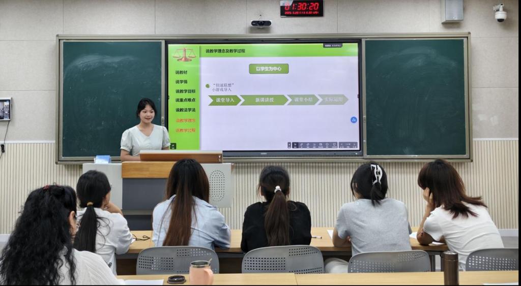 在模拟赛环节,四位选手依次登台进行说课和模拟授课展示。同学们运用生动的案例、丰富的多媒体资源,将思政教育巧妙融入课堂设计,充分展现了扎实的专业功底与创新的教学思维。从教学目标设定到重难点突破,从课堂互动环节设计到教学语言表达,每一位同学都以饱满的热情和严谨的态度,精彩地呈现了师范生的教学基本功。
