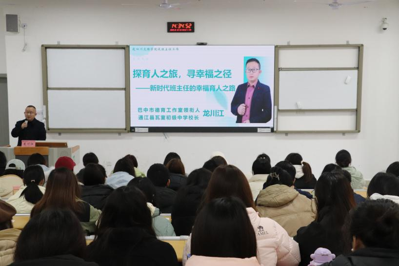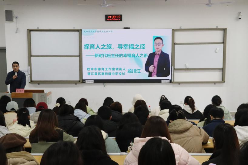 12月10日下午,伟德国际英国在莲湖东区A214教室开展第一期“大中小学思政课名师讲堂”活动,邀请巴中市优秀教育工作者、通江县瓦室初级中学校长龙川江作“探育人之旅,寻幸福之径——新时代班主任的幸福育人之路”专题讲座。学院副院长何先成主持,思想政治教研室主任曹红梅及2023级全体同学参与。
