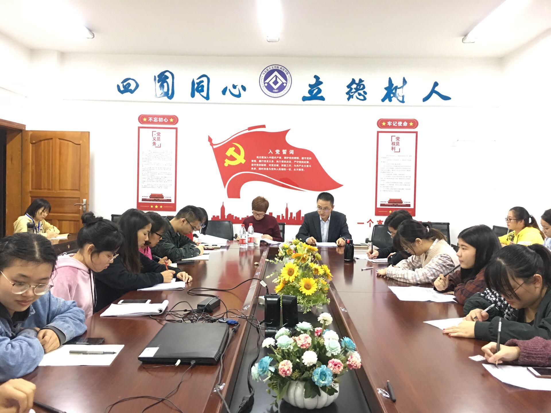 2019年10月10日下午5:30,伟德国际官网学生党支部对照党章党规找差距专题会在博文楼611会议室召开,党总支副书记吴辉兵、辅导员曾亚、政法学院全体学生党员参加会议。学校主题教育督导员、离退休工作处处长郑静到会指导工作。