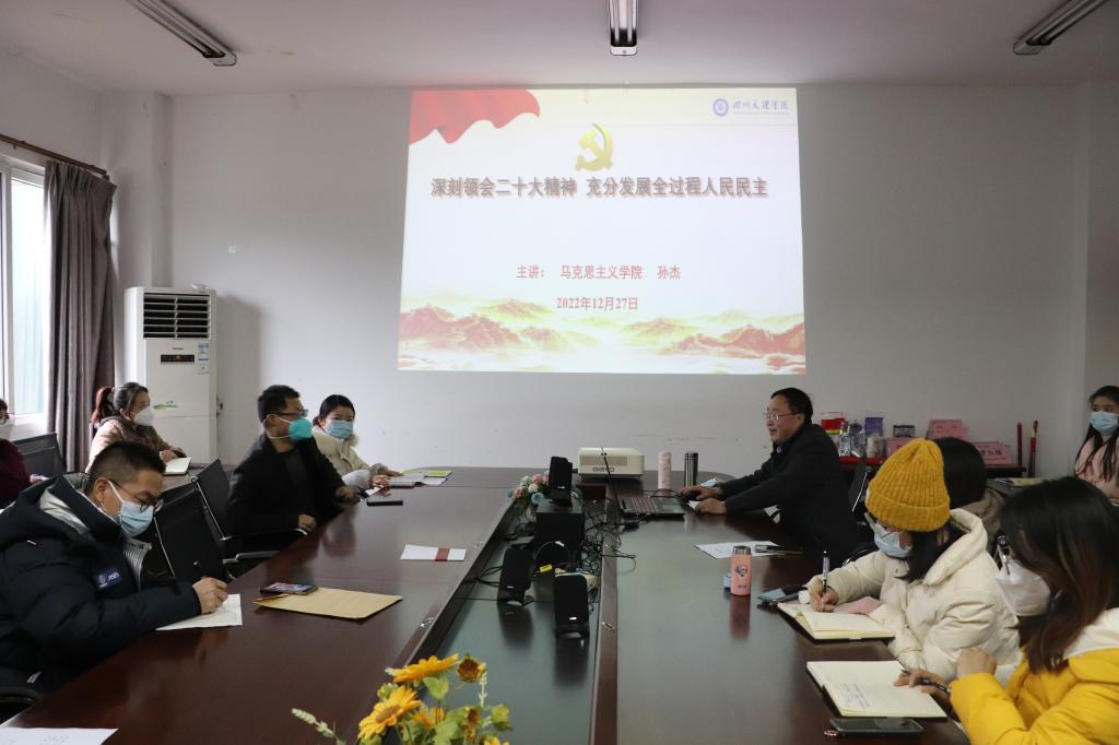为深入学习贯彻党的二十大精神,2022年12月27日,院长孙杰教授在博文楼611会议室为伟德国际英国全体教师做“深刻领会二十大精神 充分发展全过程人民民主”的专题报告。