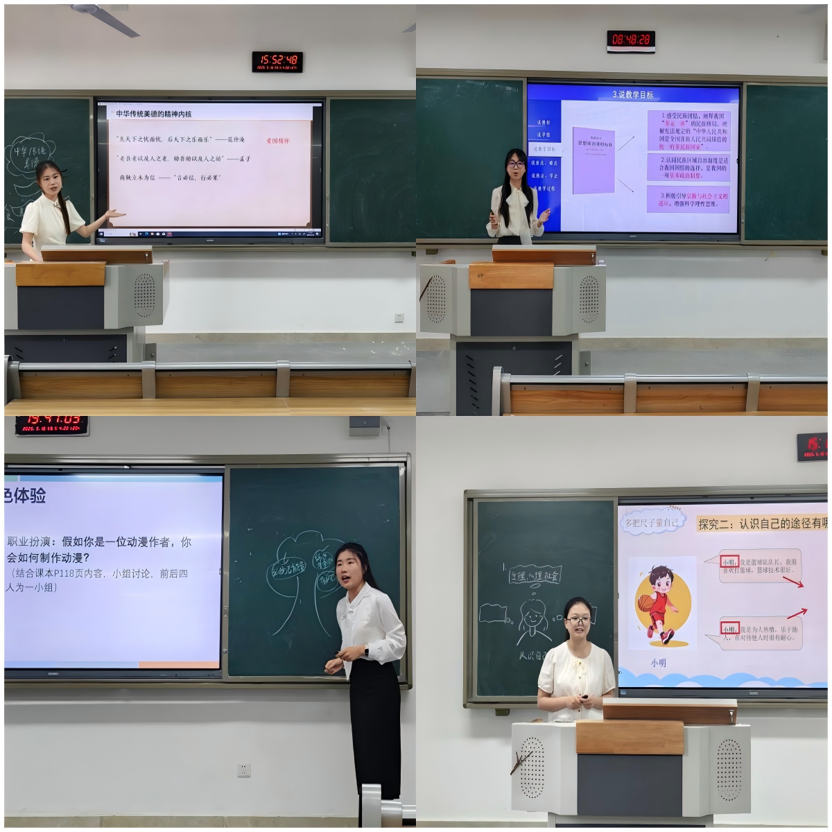 比赛过程中,各参赛选手根据教学设计方案,围绕所选教学主题进行限时3分钟的说课和10分钟的模拟课堂教学展示。选手们在教学演示中教态自然大方,教学行为规范严谨。他们准确把握中学政治课程标准要求,科学设计教学目标,教学环节层层递进、脉络清晰,板书设计巧妙呈现知识体系,展示了伟德国际官网师范生扎实的专业功底。