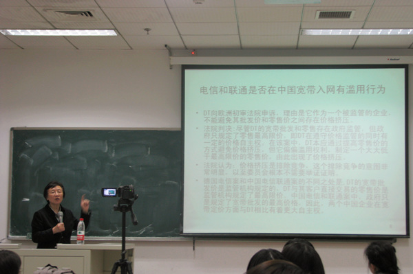 讲座伊始,王晓晔教授首先就中国宽带入网市场竞争案所面临的主要法律问题进行分析。王教授从以下三个方面分析了这一问题:一是电信和联通是否在中国宽带入网市场占据支配地位?二是电信和联通是否在中国宽带市场滥用其市场支配地位?三是电信和联通在中国宽带市场是否存在价格挤压行为?通过详细的剖析,王教授得出结论,电信和联通在宽带市场的价格歧视行为违反了中国《反垄断法》的相关规定,并且举出德国电信的案例予以比较说明。