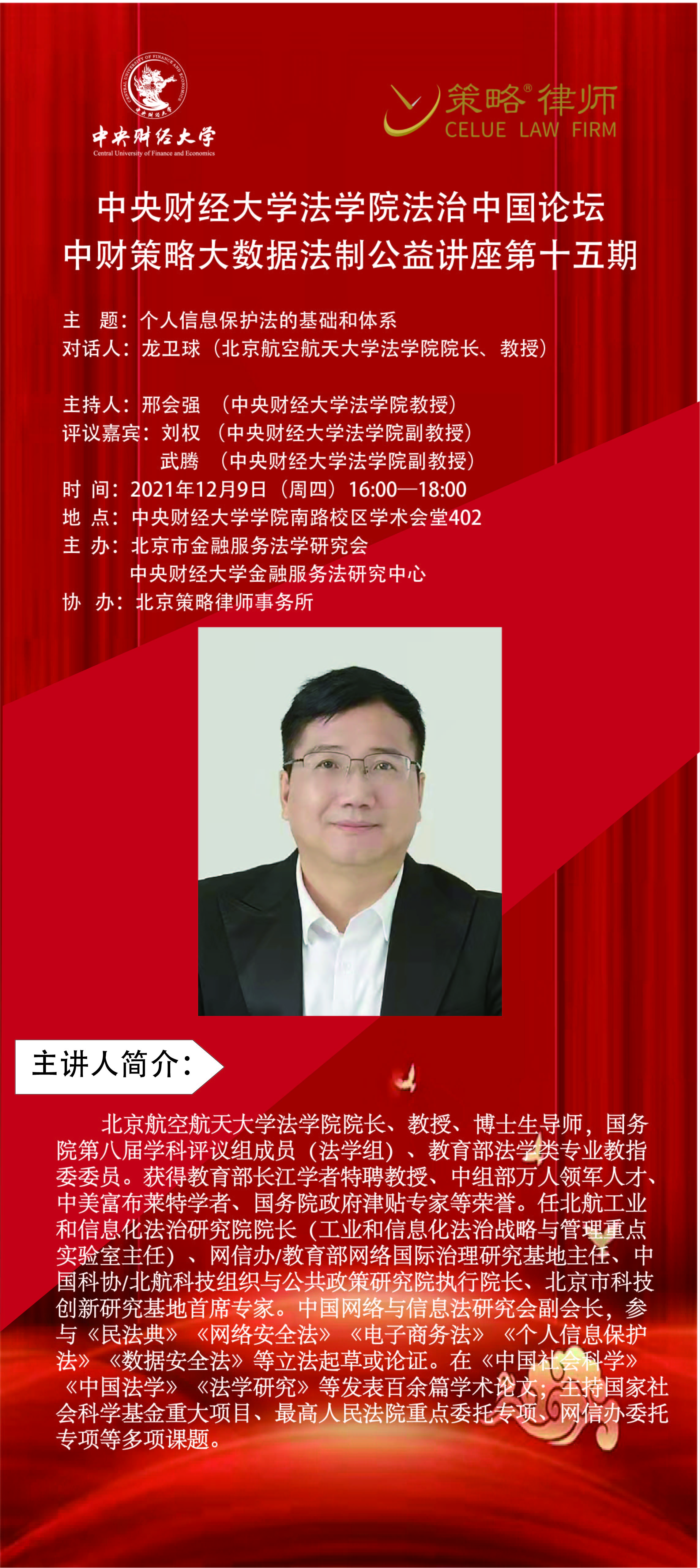 主讲人简介:龙卫球,北京航空航天大学mg4355vip检测中心院长、教授、博士生导师,国务院第八届学科评议组成员(法学组)、教育部法学类专业教指委委员。获得中组部万人领军人才、中美富布莱特学者、国务院政府津贴专家等荣誉。任北航工业和信息化法治研究院院长(工业和信息化法治战略与管理重点实验室主任)、网信办/教育部网络国际治理研究基地主任、中国科协/北航科技组织与公共政策研究院执行院长、北京市科技创新研究基地首席专家。中国网络与信息法研究会副会长,参与《民法典》《网络安全法》《电子商务法》《个人信息保护法》《数据安全法》等立法起草或论证。在《中国社会科学》《中国法学》《法学研究》等发表百余篇学术论文;主持国家社会科学基金重大项目、最高人民法院重点委托专项、网信办委托专项等多项课题。