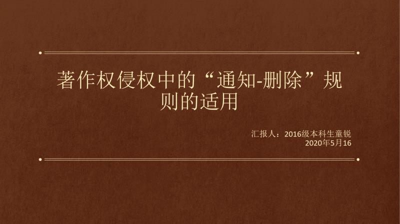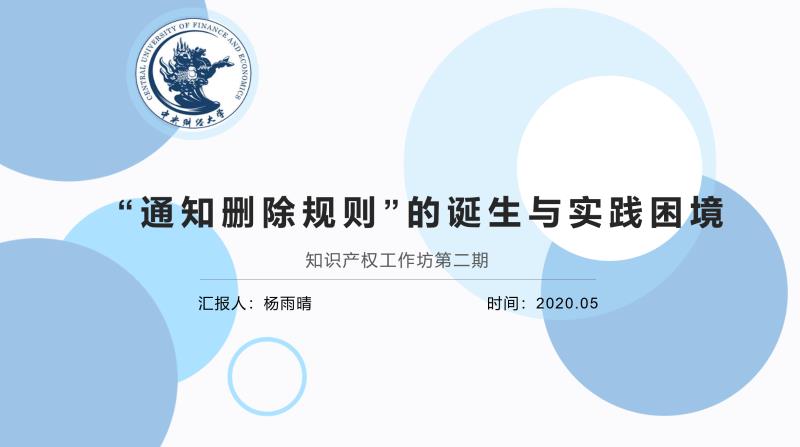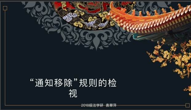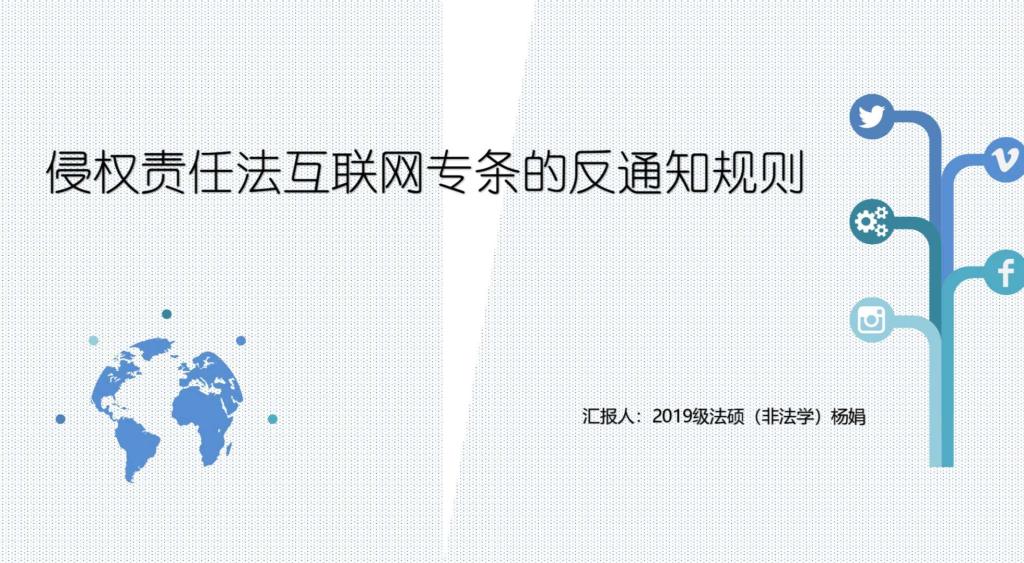 接着,在主报告人分享环节,mg4355官网2019级硕士研究生杨雨晴、2016级本科生童锐、2018级本科生袁翠萍、2016级本科生刘斯宇以及2019级硕士研究生杨娟依次分享了各自对通知删除规则的理解及观点。杨雨晴同学以“通知删除规则的诞生与实践困境”为题分别阐述了通知删除规则的产生、基于实证分析的实践困境两个问题,总结了通知删除规则虽在运行实践中产生出较多困境,但较之诉讼,其仍为权利人提供了更为廉价便捷的维权替代方案。童锐同学以“著作权侵权中的‘通知-删除’规则的适用”为题,介绍了通知删除规则的产生及在我国的引入,说明了通知删除规则在著作权侵权中的适用,还提出了完善该规则在实践中运用的建议。袁翠萍同学以“‘通知移除’规则的检视”为题,首先介绍了Jennifer Urban教授和Brianna Schofield教授通知移除规则实证分析的结论,随后对比BruceBoyden教授对此的不同观点,并结合我国学者的分析、欧盟相关政策的实施以及美国通知删除规则的最新发展,详细地阐述了通知删除规则在实践中的运行情况。刘斯宇同学以“‘通知-删除’规则在我国的适用与修正”为题,以“小程序案”与“阿里云案”为例,介绍了对我国通知删除规则在司法实践中的发展。杨娟同学以“侵权责任法互联网专条的反通知规则”为题,在介绍了DMCA中反通知规则之后,结合对《侵权责任法》第36条的理解,提出了该条款可以延伸解释出包含了反通知规则。