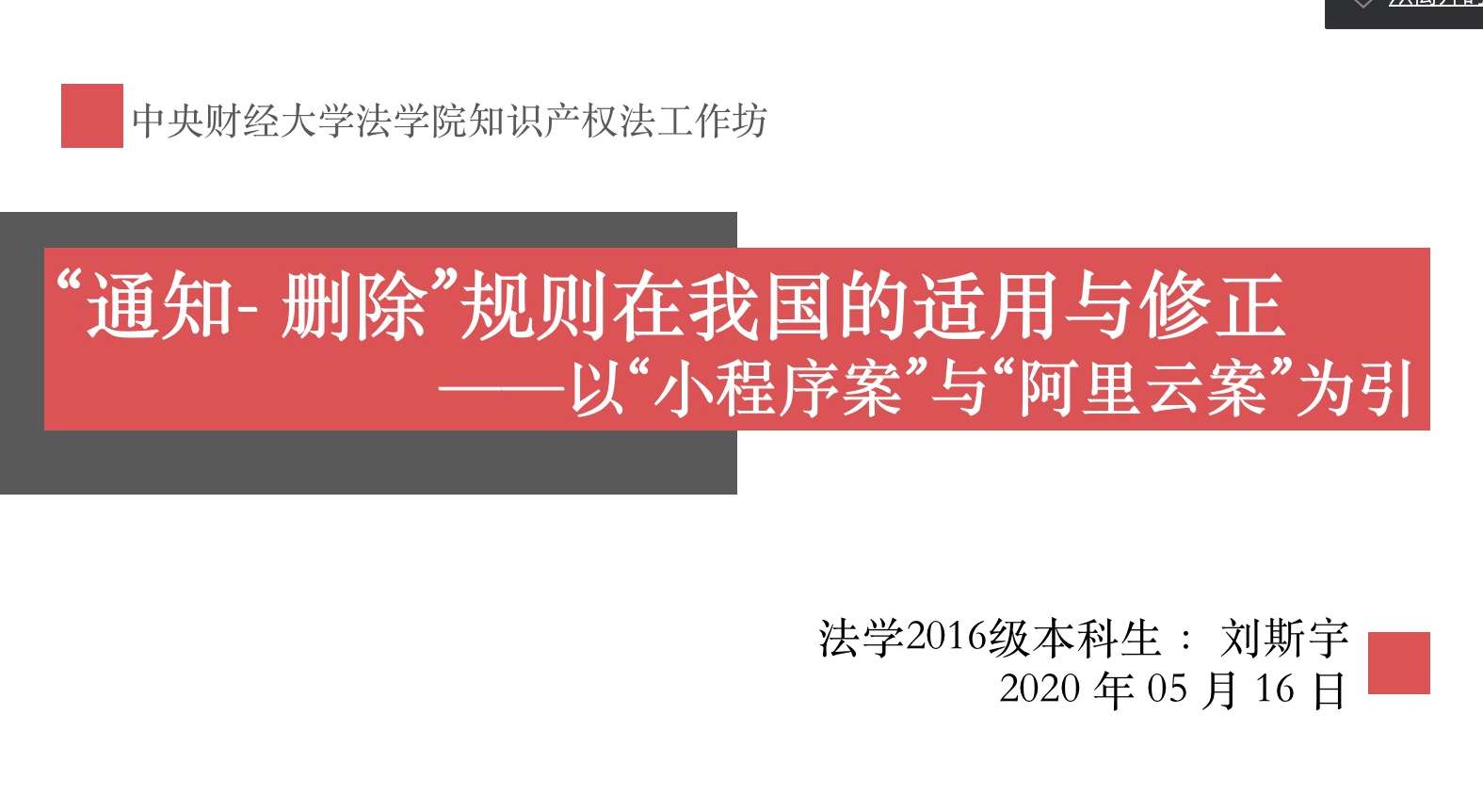 2020年5月16日下午,知识产权工作坊2020年第2期在直播平台上以线上交流与讨论方式进行,此次活动的主题是:通知删除规则的前世今生。特邀嘉宾上海财经大学mg4355vip检测中心讲师蔡元臻博士、国家知识产权局知识产权发展研究中心研究员顾昕博士,南开大学mg4355vip检测中心讲师谢晴川博士、新浪网法务部高级法务王磊、工作坊指导老师mg4355官网张金平博士参与了本次活动。工作坊主要由指导老师引导、报告人展示、评议人评议和提问、特邀嘉宾发言、指导老师总结等环节构成。此次线上活动共有46名校内外师生及业界人士参与。