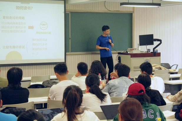 讲座伊始,周游副教授立足当代社会,以人们在读书过程中面临的几个典型问题作为开场导入,包括“为何读书”“读书的意义”等。随后,针对这些问题,他用幽默风趣的语言,多角度、多层面分享了自己独到的见解。在谈到“有无必读书单”这一问题时,周游副教授指出,学生应该更加注重全方面发展,形成属于自己的一套独特的知识体系。同时,他向同学们展示了相关调研内容,并以此为基础,详细解说了社会面上的读书情况。周游副教授独特的演讲风格很快激发了同学们的兴趣,调动了他们的积极性。