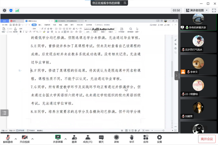 最后,针对培养方案执行过程中曾出现的问题,李伟副院长整理了许多相关典型的事例,向同学们进行了针对性地举例说明。较为典型的情况有:英语课学分修够,但类别不正确;没有进行线上举行的“劳动与安全教育课”的考试,导致无法通过毕业审核;总学分和各模块已修满,但平均学分绩点未达到1.5(65分)等。随后,李伟副院长提醒同学们一定要仔细阅读并理解培养方案的内容,不能忽视其重要性,避免出现以上问题影响毕业和学位审核。