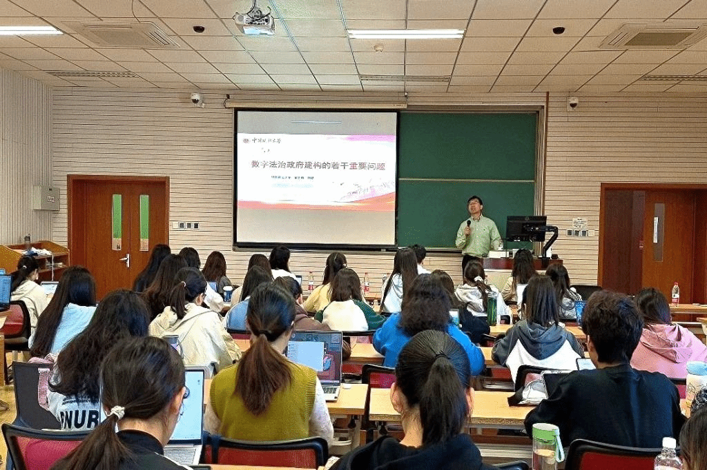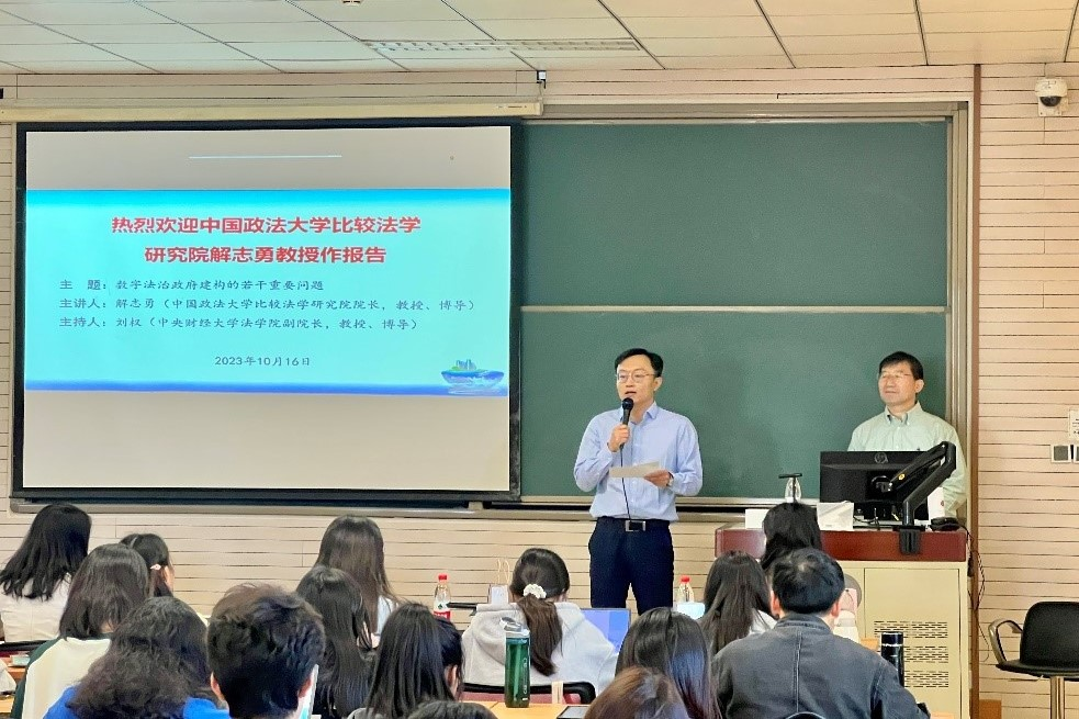 2023年10月16日上午,中财数字法学前沿讲座第2期成功举办,中国政法大学比较法学研究院院长、《比较法研究》主编解志勇教授应邀为mg4355官网师生做了主题为“数字法治政府建构的若干重要问题”的讲座。mg4355vip检测中心副院长刘权教授担任主持人,mg4355vip检测中心李敏老师、刘馨宇老师等全校近百名师生参加。