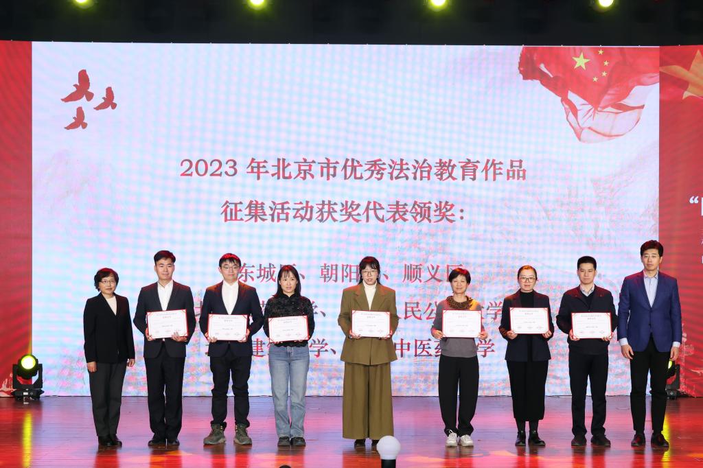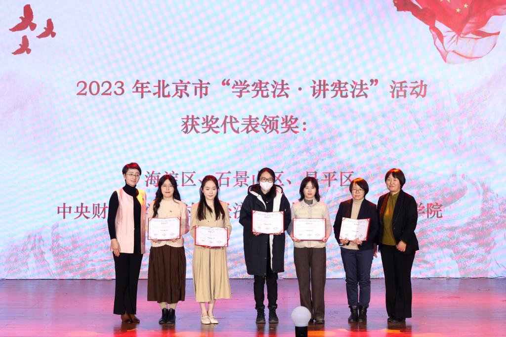 诵读完毕后进入颁奖环节。北京市教育委员会政策研究与法制工作处处长王艳霞和校宣传部部长、新闻中心主任雷洪峰为2023年北京市学生“学宪法·讲宪法”活动一等奖获奖代表颁奖,北京教育融媒体中心党委副书记、主任张淑芳和mg4355vip检测中心副校长栗峥为2023年北京市师生法治教育作品征集活动一等奖获奖代表颁奖。