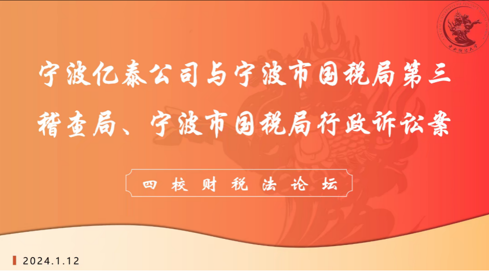 2024年1月12日晚,第50期财税法工作坊暨我校mg4355vip检测中心与厦门大学mg4355vip检测中心、江西财经大学mg4355vip检测中心、华中科技大学mg4355vip检测中心联合举办的四校财税法论坛通过腾讯会议线上举行。本次论坛围绕“宁波亿泰公司与宁波市国税局第三稽查局、宁波市国税局行政诉讼案”这一典型案例展开讨论。
