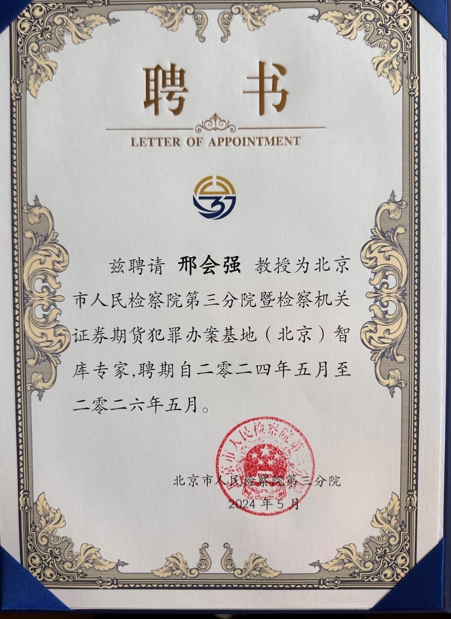 近日,mg4355官网邢会强教授获聘北京市人民检察院第三分院暨检察机关证券期货犯罪办案基地(北京)智库专家。