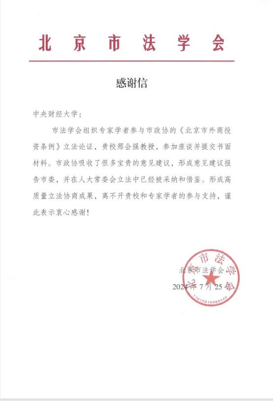 7月26日,北京市法学会向我校发来感谢信,感谢邢会强教授对《北京市外商投资条例》的完善建议。