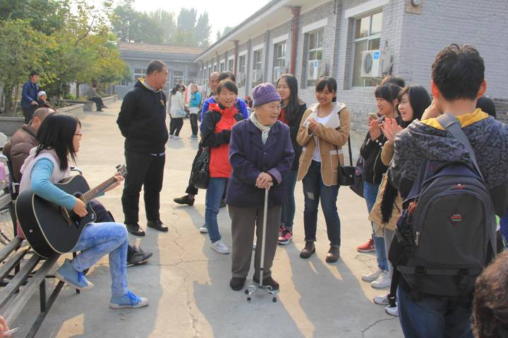 之后同学们来到室外给老爷爷老奶奶表演节目。室外的空地上有不少老人在晒太阳,看到同学们的表演,他们纷纷围了过来。现场气氛顿时热闹起来。第一个节目由温练如、索娅和余雁琳三名同学共同表演,他们为老人们带来动听的歌曲 《外婆的澎湖湾》,不少老人被这首歌勾起了童年的回忆,跟着同学们一起唱了起来。接下来,熊海日同学为老人们带来一首腾格尔的《天堂》,歌声抑扬顿挫,十分动听,赢得老人们的热烈的掌声。在这期间,一位七十多岁的老爷爷给同学们秀了一段京剧,老爷爷精神振奋,唱的十分有劲,赢得同学们阵阵喝彩。