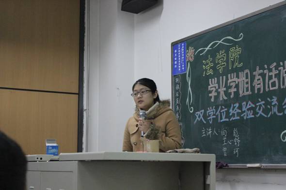 接下来发言的是2013级法学硕士研究生一年级曾珂同学,她在本科四年学习期间取得了法学、管理学学士双学位,辅修了会计学。其发言主要以会计学学习为落脚点,进而延伸开来,谈到课程辅修的问题。她通过讲述了自己的学习经历,详细地为同学们分析了选择辅修的利与弊。另外,她还强调了要正确处理主修课程与辅修课程之间的关系,劝诫同学们要充分利用好平时的学习时间,不要养成拖沓的毛病。