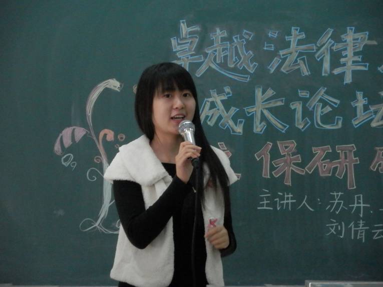本校直保攻读法学研的刘倩云同学则在发言中简略介绍了保研的相关情况,并大致讲述了大学生活的丰富内容,提出了积极参加社会实践、加强心理建设等建议。