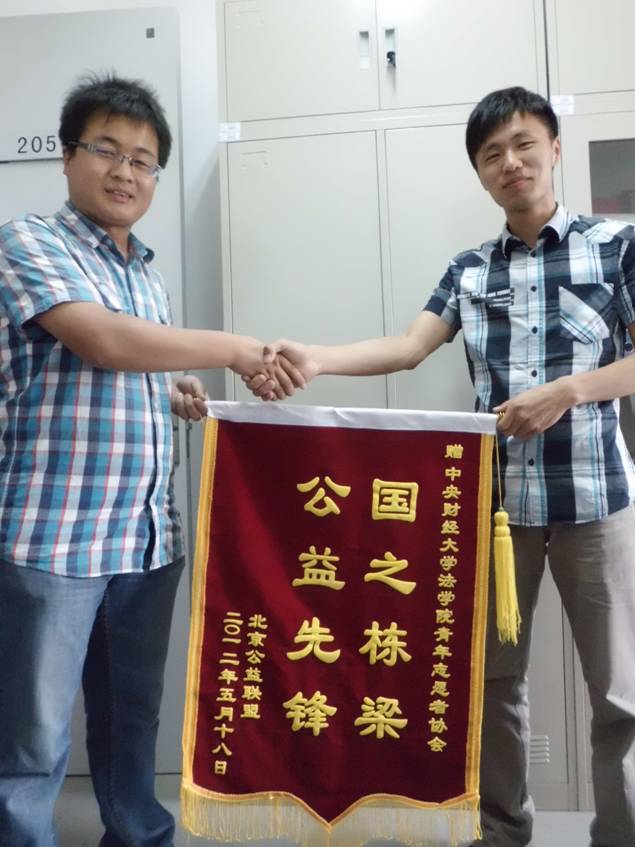 5月22日上午,残疾人代表及北京公益联盟负责人向mg4355官网送来一面绣有“国家栋梁,公益先锋”的锦旗,对mg4355官网志愿者在“圆梦故宫”志愿活动中的奉献表示感谢。院团总支书记李杰以及青年志愿者协会部长荣宏橙代表学院接受了锦旗。