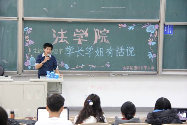 徐昌举同学首先作了简单的自我介绍,当年他从四川江油骑行来北京报到的经历引得同学们唏嘘不已。而初到大学时的迷茫并未困扰他很久,他便投入紧张的学习中了。徐昌举同学谈到,除了日常的学习,他还热心于参加校内外多种形式上午讲座,一来可以增长见识,二来可以遇到各领域的优秀的人士。他还强调,这时候参加的讲座以及在课余看的书籍都为之后做自己认为有意义的事提供了基础和准备。学习之余,他致力于自行车运动,并谈到自己与朋友创建了“自由中财自行车协会”。他鼓励同学们充分发展兴趣爱好,把握机会培养自己多方面的能力,并且参加校内外的活动,多与校内外的优秀人才接触,拓展自己的视野。他还通过自己的艰苦训练鼓励同学们坚持自己的选择,努力就会有收获。