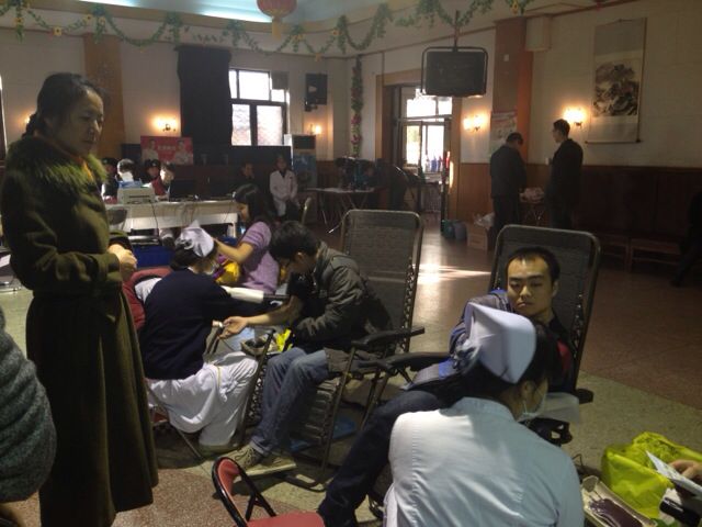 上午8点钟,献血同学陆续来到了采血地点工会活动中心。初冬的早晨路上稍有些冷冽,但丝毫不影响同学们献血献爱心的热情。在工会活动中心,献血工作正在有条不紊地开始着,同学们填表、体检、抽血,秩序井然。献血当天蒙老师一早就赶到了现场,不断和献血同学聊天的方式让大家的心理得到放松,还在现场协调工作、为同学们服务。