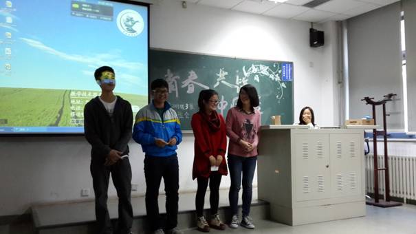 本次班会主持人为王济敏、张伟、伍可盈、张正虎四位同学,在进行了幽默而简洁的开场白后,班会正式开始。首先,由女生819宿舍的四位同学合唱了一首名为《当》的流行歌曲,耳熟能详的旋律回荡在教室中,引起在场同学们的共鸣,同学们纷纷随之和唱,现场的气氛迅速升温。曲毕后掌声雷动,喝彩不断。接下来是琚京丰同学带来一段精彩激昂的关于做真正男人的演讲,整个幻灯片展示以C罗为核心人物,并搭配着丰富多彩的视频资料,生动有趣又不乏激励奋进,凸显出青春二字的意义与价值。在主持人诙谐的介绍后,有一组表演精彩上演。女生828宿舍的三位同学分别用热情洋溢的现代舞、清脆婉转的竹笛独奏、抒情优美的扇子舞来展现青春的多姿多彩,让同学们称赞不断。“台上一分钟,台下十年功”,同学们为了本次主题班会都精心准备,用高涨的热情支持响应,促成本次主题班会的顺利召开。