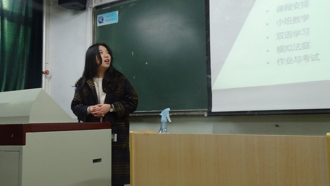 随后,朱志同学与学弟学妹们进行了经验交流分享。首先,她围绕课程安排、小班教学、双语学习、模拟法庭以及作业考试等内容详细介绍了涉外班的特色,加深同学们对本专业的了解和认识;随后,她从自身的经历和体验出发,为同学们提供了大学四年系统性的指导规划;最后,她鼓励学弟学妹们多提问、多交流,与学长学姐形成良性的互动交流。