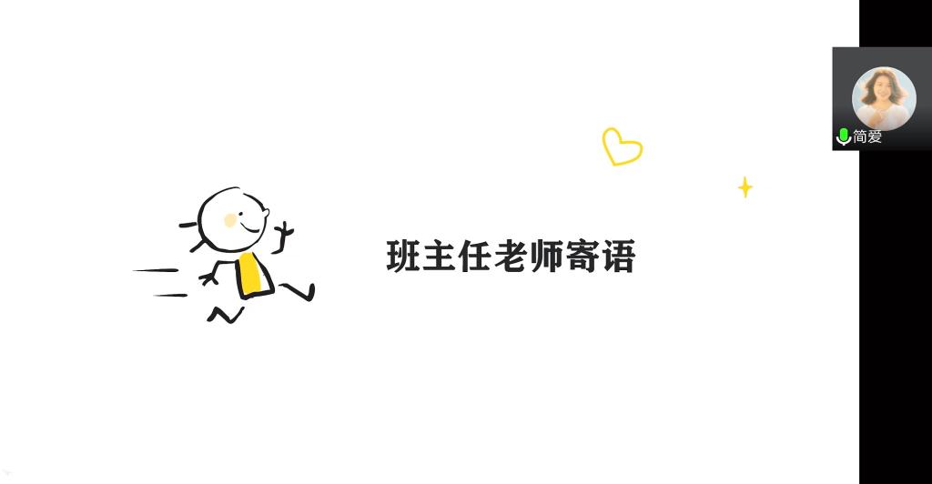 接着,法学19-2班班主任简爱老师也对同学们提出了几点建议。首先,她结合同学们的打卡情况,向同学们指出,大学生应学会独立和担当,提高自我管理的能力。随后,她提醒同学们要适应线上教学,合理规划自己的时间,把心态沉静下来,努力跟上线上教学节奏,认真学习专业知识,遇到问题随时与老师沟通。在学习中做到自律,不依靠外界约束,从自身做出改变。另外,简爱老师建议同学们利用好现阶段网上的学习资源,树立理想,增强自身能力,做好未来规划。