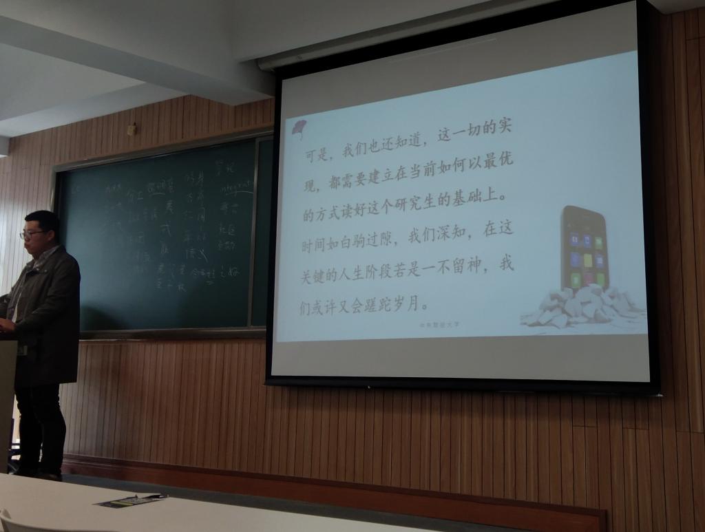 首先,蒙老师致开场辞。在简单介绍刘学涛学长的在校经历后,蒙老师特别希望新生能够从优秀学长的经历中汲取有益经验,更充实地度过研究生阶段的学习和生活。