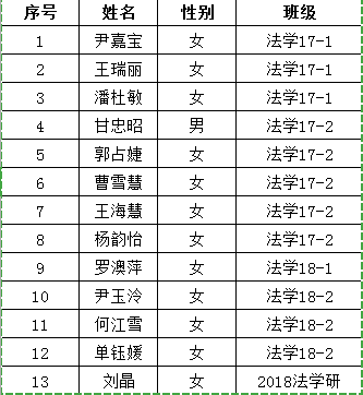 根据《关于招募2019年卓越财经法治人才夏令营志愿者的通知》要求,在学生本人申报的基础上,经综合考量,决定拟招募尹嘉宝等13名学生为2019年卓越财经法治人才夏令营志愿者,现予以公示(名单如下,排名不分先后)。
