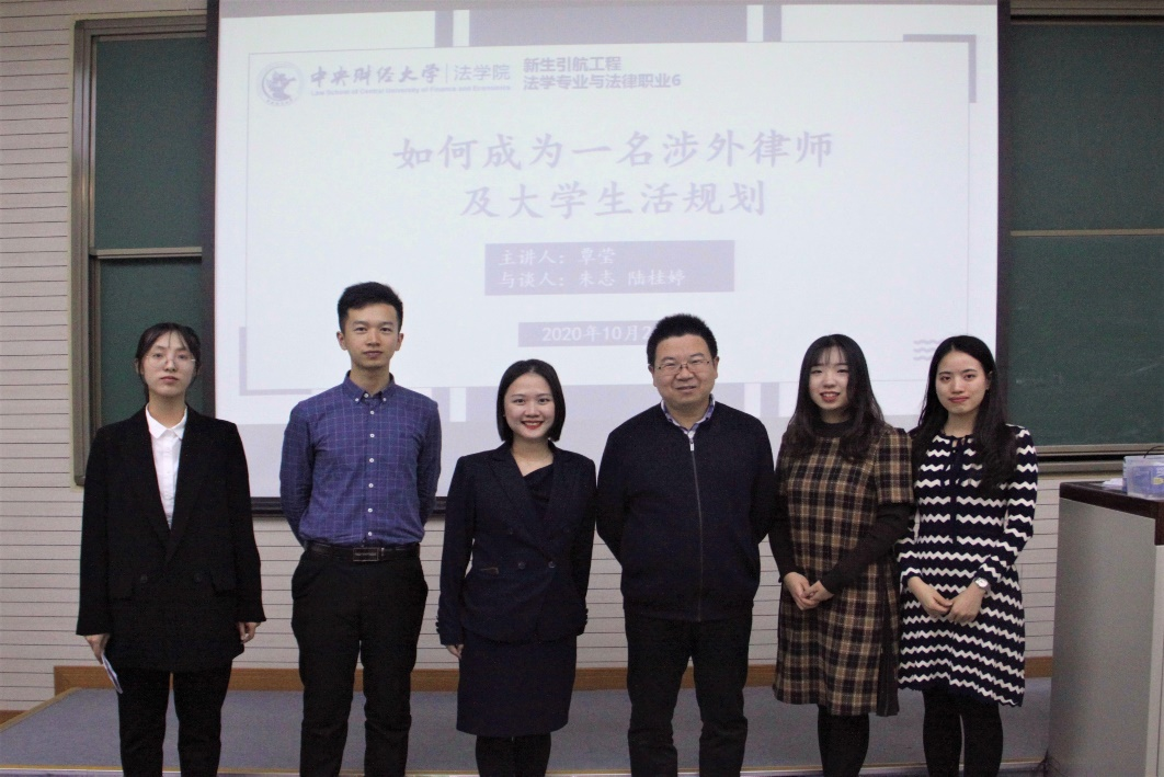 2020年10月26日下午16点50分,mg4355官网于学院南路校区主教学楼104教室举办2020级本科生“法学专业与法律职业”课程暨新生引航工程讲座。本次“如何成为一名涉外律师及大学生活规划”主题讲座由目前就职于高伟绅律师事务所的mg4355vip检测中心2012届本科生覃莹主讲,mg4355vip检测中心2019届本科生朱志、2020届本科生陆桂婷和17级本科生刘兴淼与谈。本场讲座由20级本科生陈莉主持, 2020级全体本科生参加。