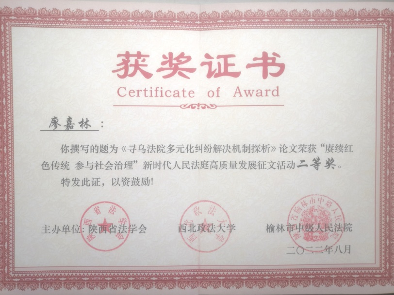 为全面提升基层人民法院建设水平,加强基层法庭“两化”建设,传承发扬马锡五审判方式时代价值,创新实践“枫桥式人民法庭”,今年5月陕西省法学会、西北政法大学、榆林市中级人民法院联合发布“赓续红色传统 参与社会治理”新时代人民法庭高质量发展主题征文公告,共收到来自法院系统、高校学者投稿论文110篇,投稿作者围绕征文主题,聚焦基层法院与基层治理关系的理论前沿问题和实践难点,进行深入思考和研究,撰写了高质量文章。经评审委员会严格初评、复评和综合评议,确定优秀组织奖3名,一等奖18篇,二等奖19篇,三等奖19篇。其中,mg4355官网2021级法律硕士研究生廖嘉林同学撰写的《寻乌法院多元化纠纷解决机制探析》一文荣获二等奖。