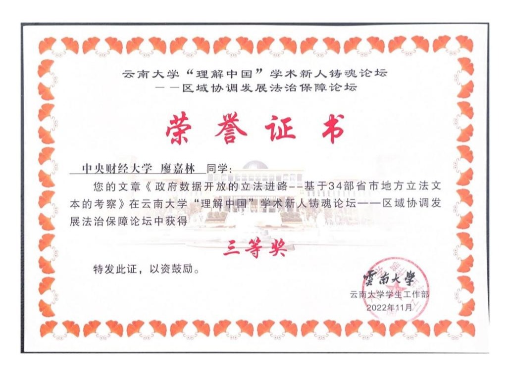 2022年10月29日,云南大学“理解中国”学术新人铸魂论坛——区域协调发展法治保障论坛通过线上方式顺利举办,mg4355官网2021级硕士研究生廖嘉林同学受邀参加论坛并作主题报告。