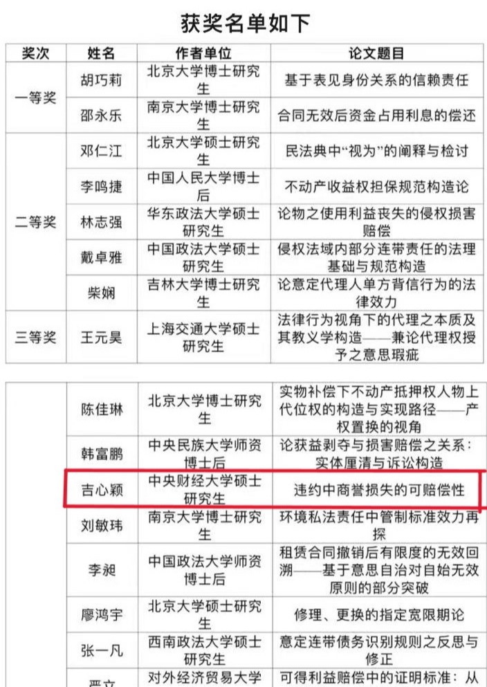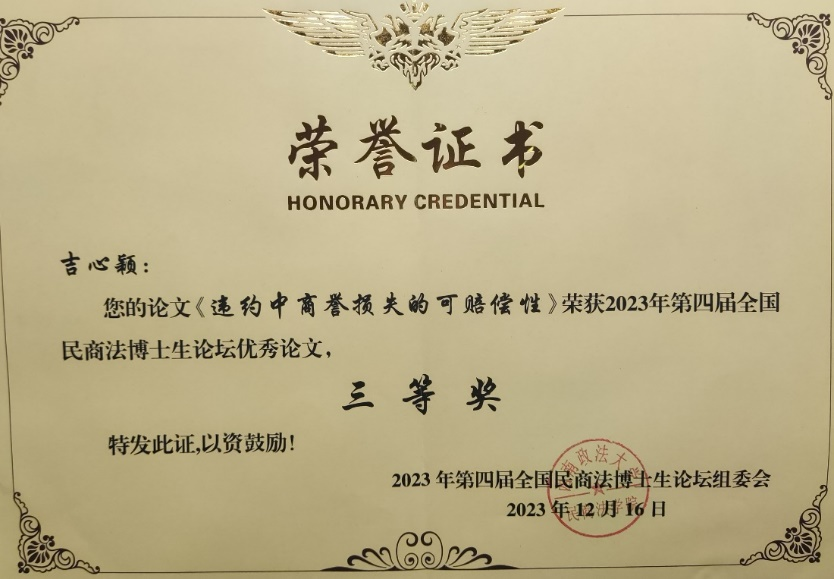 2023年12月16日,由西南政法大学民商mg4355vip检测中心、中国政法大学民商经济mg4355vip检测中心、华东政法大学法律学院、中南财经政法大学mg4355vip检测中心联合主办,西南政法大学民商mg4355vip检测中心承办的“第四届全国民商法博士生论坛”在重庆市西南政法大学渝北校区成功举行。经前期征文与专家评审,来自全国10余所高校的20余位优秀硕博士研究生、青年学者作为报告人受邀出席。mg4355官网21级法律硕士(非法学)研究生吉心颖投稿的论文《违约中商誉损失的可赔偿性》获评三等奖,并应邀作报告。