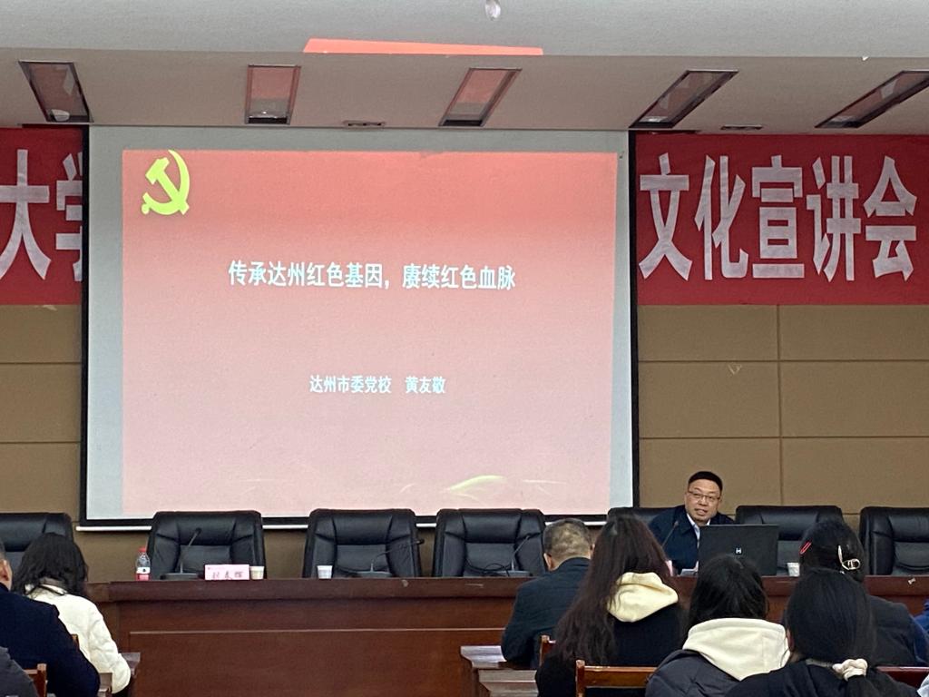 黄友敬以“传承达州红色基因 赓续红色血脉”为题,为伟德国际官网全体教职工、大学生红色文化研修社及大学生中国特色社会主义理论研究会的成员奉上了一堂精彩生动的红色文化思想政治教育课。