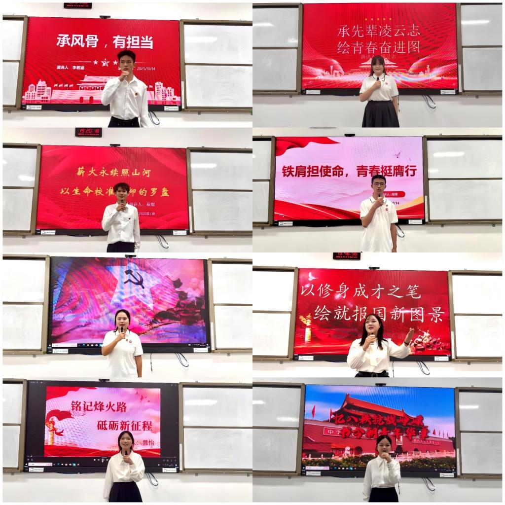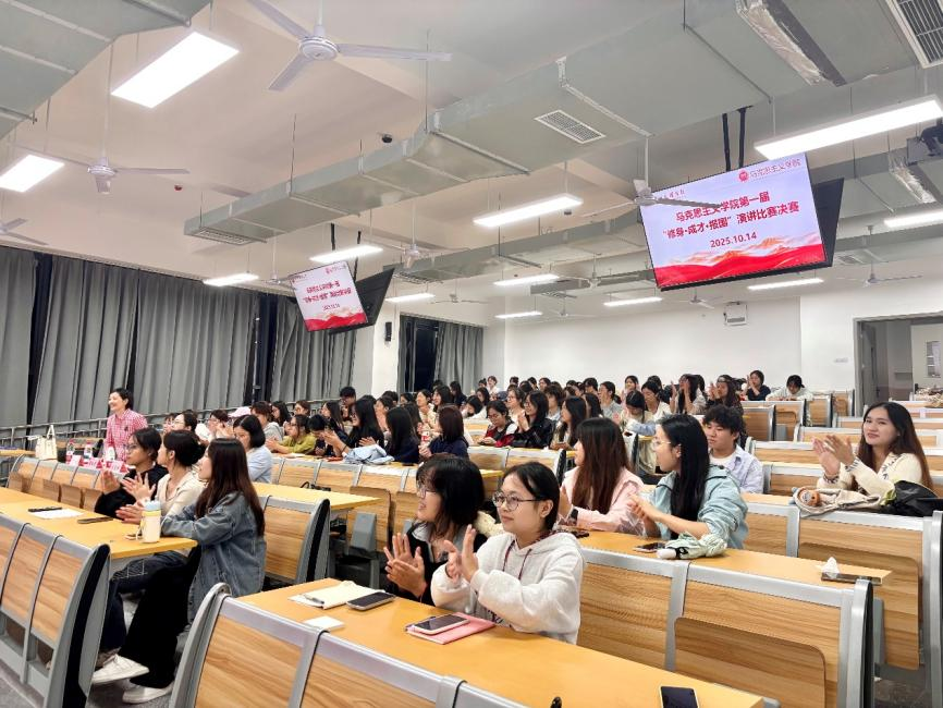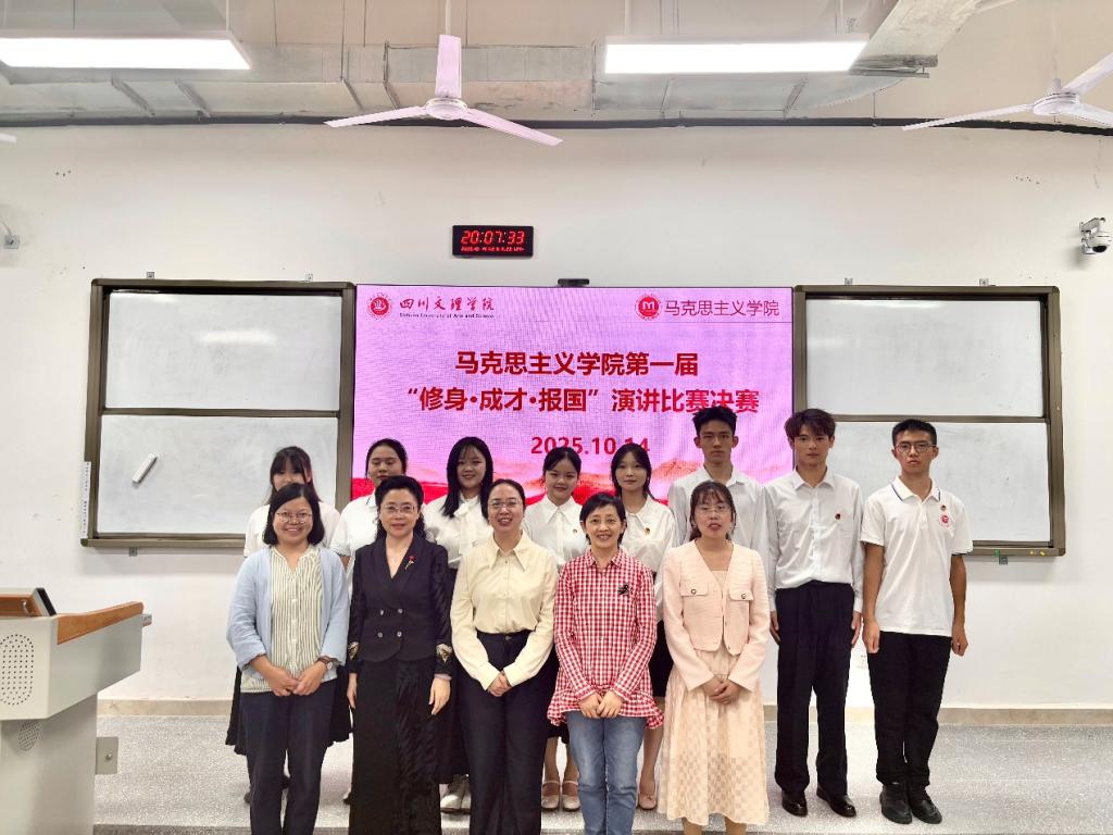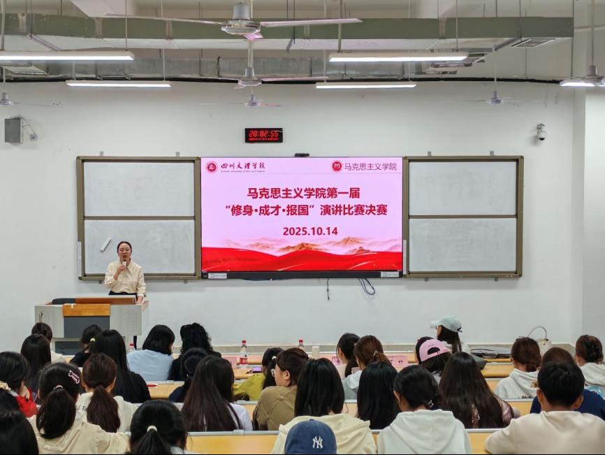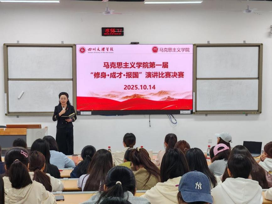 为弘扬修身立德之风,激发学子成才之志,厚植报国情怀,马克思主义学院于2025年10月14日19:00在东区教室A318举办首届“修身·成才·报国”演讲比赛决赛。院党委副书记周春滟、正处级组织员丁竹、想政治教育教研室主任曹红梅、专任教师张岚、专职辅导员覃秋霞出席比赛并担任评委全体大一新生到场聆听比赛。