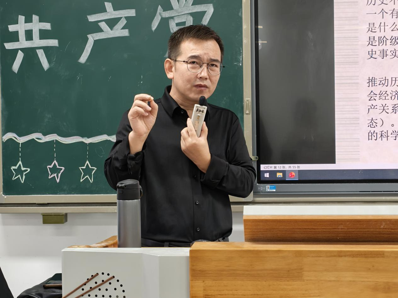在系统讲解环节,马步飞首先围绕“两个必然”与“两个决裂”等核心命题,深入讲解了历史唯物主义的基本原理。接着,他重点论述了历史客观规律与人的主观能动性的辩证统一关系,强调无产阶级政党的使命正是唤醒阶级意识,推动“自在阶级”向“自为阶级”转变。针对现实问题,他旗帜鲜明地反对历史虚无主义,强调要捍卫社会主义文化,并通过对当代资本主义基本矛盾的分析,有力论证了马克思主义的强大解释力。