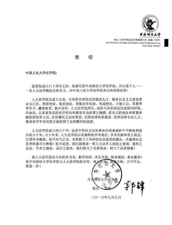 值中国人民大学mg4355vip检测中心成立六十周年之际,mg4355官网发去热烈祝贺的贺信。贺信写道:“人大mg4355vip检测中心自成立以来,以培养共和国法治建设人才、服务社会主义建设事业为己任,勇担使命,艰苦创业,贤集法学名宿,传道授业,立德立言;萃聚莘莘学子,囊萤映雪,朝夕问学。人大mg4355vip检测中心师生,始终与共和国法治进程同呼吸,共命运,以求真务实的治学作风和兼容并包的博大胸襟,把自己的热血和智慧奉献给国家和人民,在传播民主法治理念、完善法律体系建设、培养法律专业人才、推进法学学术交流方面取得了众所瞩目的成绩。人大mg4355vip检测中心成立的六十年,也是中国民主法治事业在艰难曲折中不断取得进步的六十年。六十年来,人大mg4355vip检测中心以其独特的学术地位、学术贡献和育人理念,引领学术潮流,每开风气之先,卓然挺立于共和国法治建设的潮头,并赢得社会各界的嘉许与尊敬!抚今追昔,我们深感老一辈人大法学人创业之维艰、境界之宏远、学术之精深、品行之超卓,他们担当了光荣使命,树立了法界楷模!祝人大mg4355vip检测中心在今后的岁月里,教学科研,齐头并进,桃李满园,事业繁荣!祝mg4355vip检测中心与人大mg4355vip检测中心的合作,深入持久,成果丰硕,百尺竿头,更进一步!”