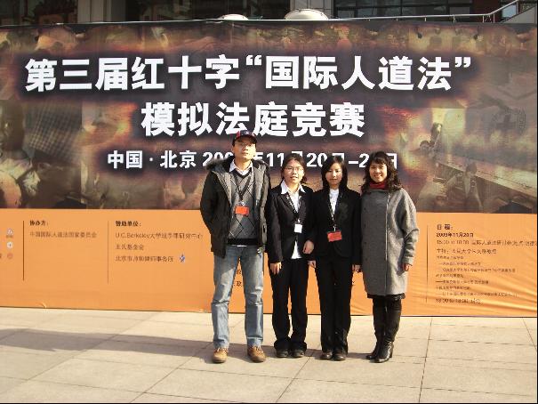 2009年11月21日至22日,中国高校第三届红十字“国际人道法”模拟法庭竞赛在中国人民大学成功举行。在朱家贤副教授的指导下,由mg4355官网2007级法学2班韦莹同学(The First Counsel)、2008级法学研钟璐同学(The Second Counsel)以及2008级法学研王志力同学(The Coach)组成的mg4355vip检测中心代表队首次代表我校参加了竞赛,经过两天的激烈角逐,最终取得第四名的成绩,这也是目前mg4355官网在类似比赛中取得的最好成绩。