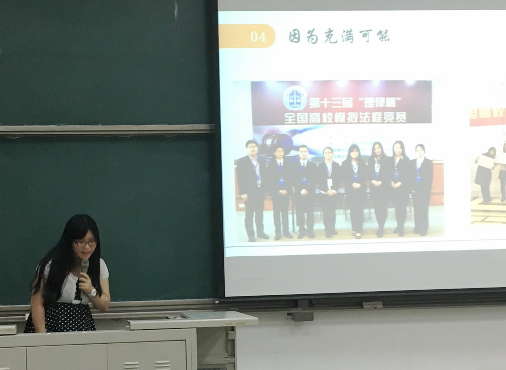 周心怡同学首先向在场的同学们就“理律杯”模拟法庭比赛做了一个简单的介绍,随后通过分享自己参加比赛、准备比赛时的一些真实的照片,使大家对该比赛有了更加生动具体的认识,同时也为参赛队员付出的辛苦和努力而感动。当谈到参加这一比赛的收获时,她提到了两组关键词。一是“有意思”,因为比赛的赛题新颖,而且极具综合性,囊括了很多部门法的知识,队员们也能轻易地从中找到自己最感兴趣的问题。二是“成就感”,通过将近三个月的认真准备、激烈讨论、熬夜写作、反复修改以及在庭辩中的言辞交锋、逻辑对抗,参赛队员对于法律工作所需要的细致和严谨的品质有了更加深刻的认识,同时其自身的综合能力得到了全面的提高,通过比赛亲眼见证了自己的迅速成长和变化。