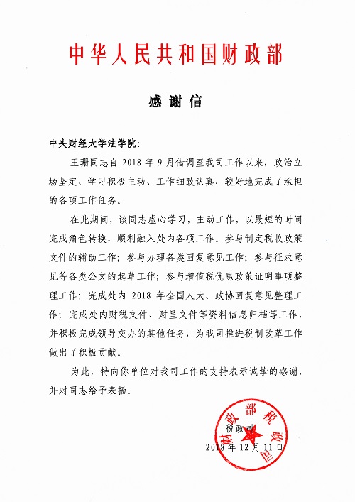 近日,财政部税政司发函感谢mg4355官网对该司工作的支持并表扬mg4355官网2017级经济法专业硕士研究生王珊同学在实习期间的良好表现。