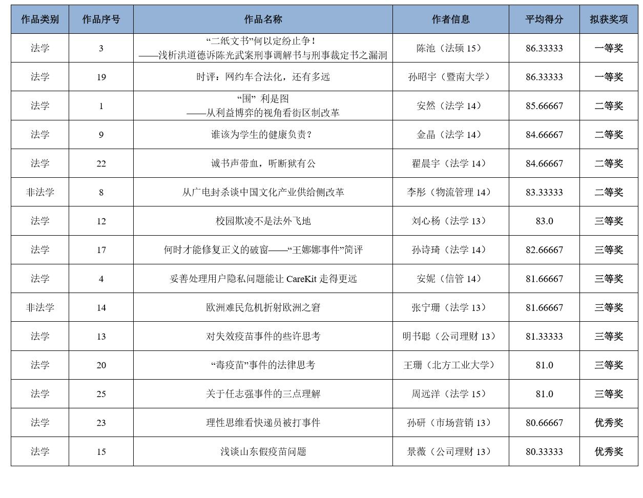 评选结果自公告之日起公示至2016年5月15日22时。公示期间如有异议,请以word形式附带证明材料,发送邮件至本报邮箱zhongcaifaxuebao@163.com。公示无异议后,组委会将择期举行颁奖仪式。获奖作品和其他部分投稿作品有机会在《中财法学》报和学院网络媒体发表。