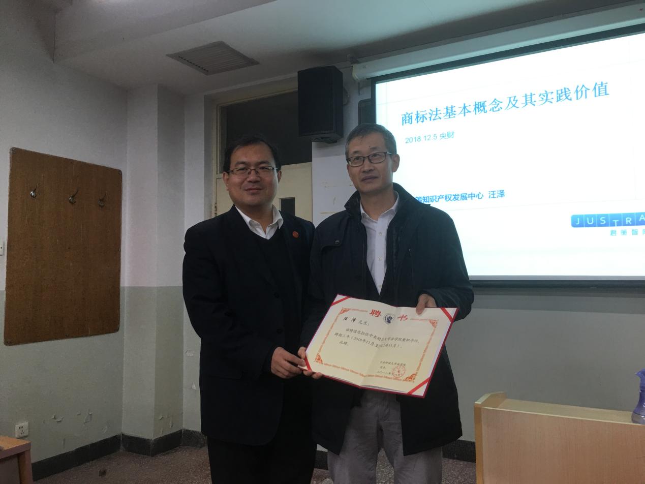 2018年12月5日,北京君策知识产权发展中心主任、国家知识产权专家库专家汪泽做客mg4355官网,于学院南路校区主教楼301教室进行“商标法基本概念及其实践价值”的主题讲学。mg4355官网院长尹飞教授出席,mg4355vip检测中心2017级、2018级硕士参与本次讲学。本次讲学由mg4355vip检测中心知识产权研究中心主任杜颖教授主持。