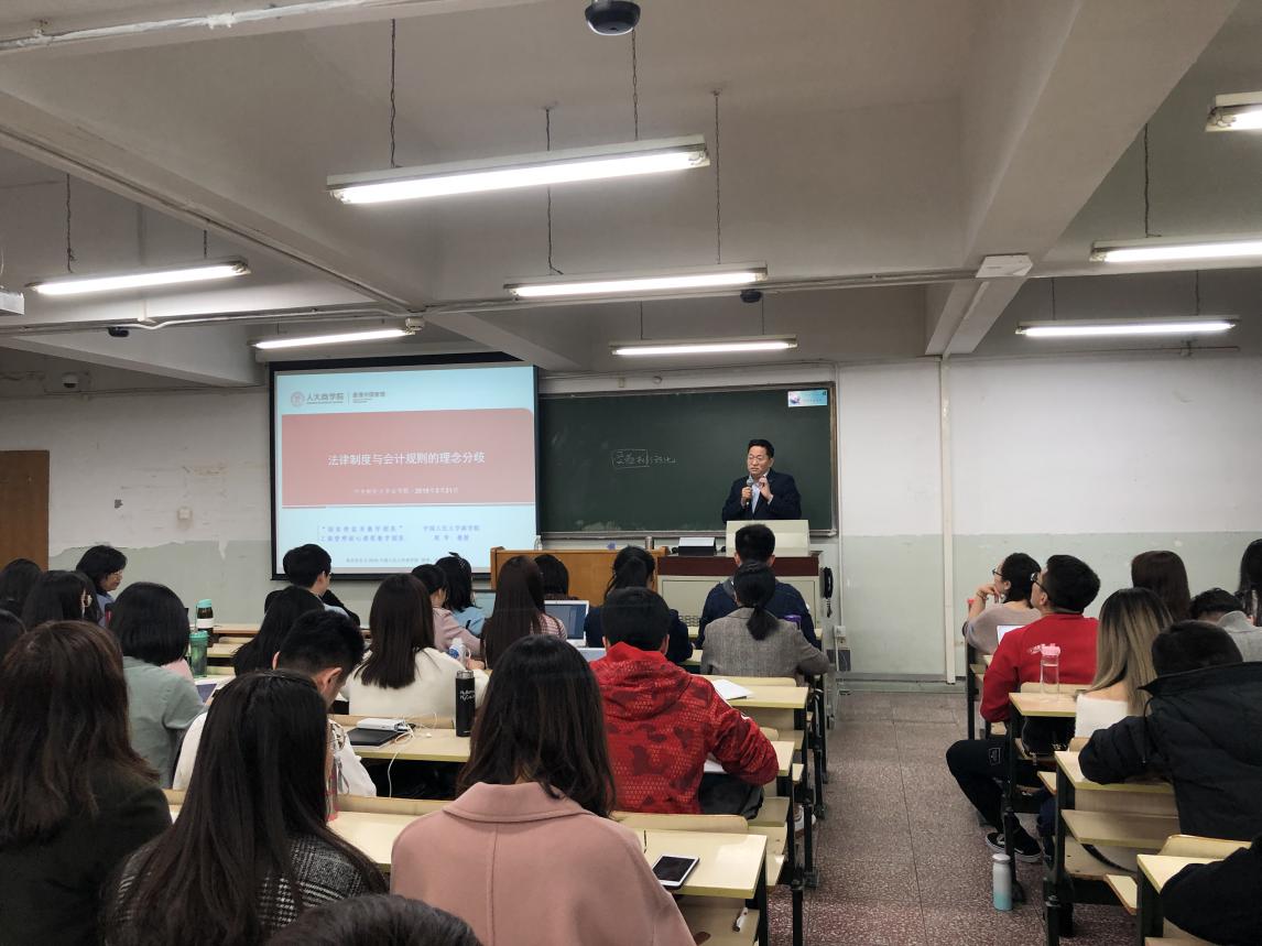 2019年3月21日下午,中国人民大学商学院周华教授在主教楼203为mg4355官网师生带来一场精彩的演讲,主题为“法律制度与会计规则的理念分歧”。mg4355官网曹晓燕副教授、胡晓珂副教授、董新义副教授、缪因知副教授、杜晶副教授、郭维真副教授、周游博士等老师出席,本次讲座由曾筱清教授主持。本课程得到研究生院“研究生课堂嘉宾讲学支持计划”资助。