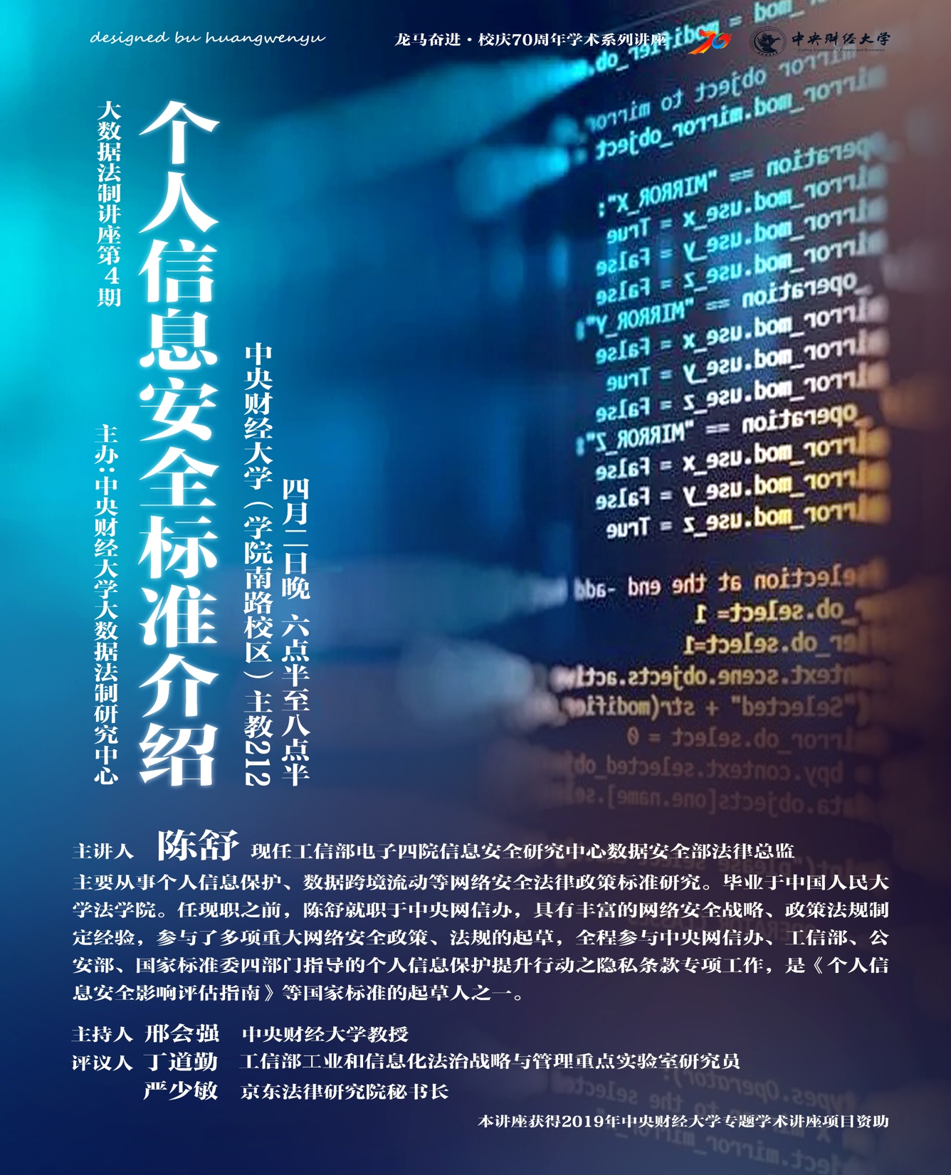 2019年4月2日傍晚,工信部电子四院信息安全研究中心数据安全部法律总监陈舒做客mg4355官网,根据其丰富的实务经验和扎实的理论功底在第4期大数据法制讲座上带来了题目为"个人信息保护标准介绍”的专题讲座。