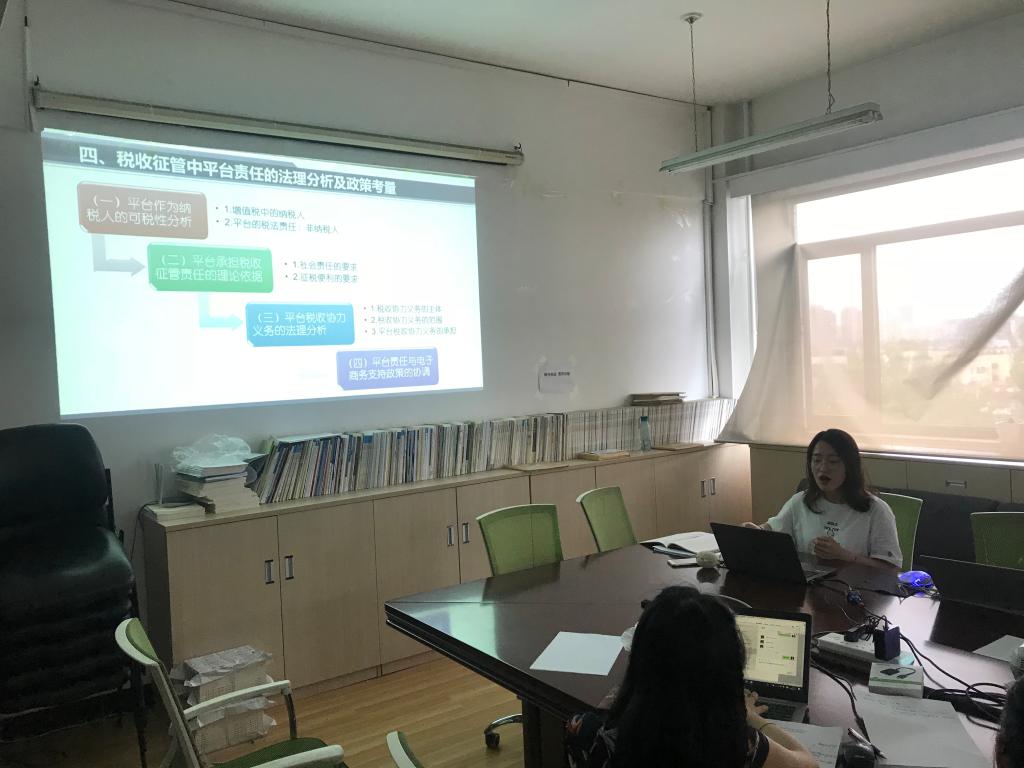 2017级法学硕士王珊同学就《电子商务增值税征管中的平台责任—以To C模式下货物贸易为视角》进行了汇报交流。王珊首先从五个方面介绍了选题意义,其次界定了平台在私法和税法上的法律地位,然后认为应该借鉴域外平台责任的立法经验,并结合我国税收征管中有关平台责任的规定,完善我国以平台为中心的电子商务增值税征管制度。2018级法律硕士夏燕同学从两个方面进行了评议:一是就框架问题,未讨论我国现状直接写国外经验借鉴是否有些突兀;二是就内容而言,如何避免前后文在理论方面出现重复。