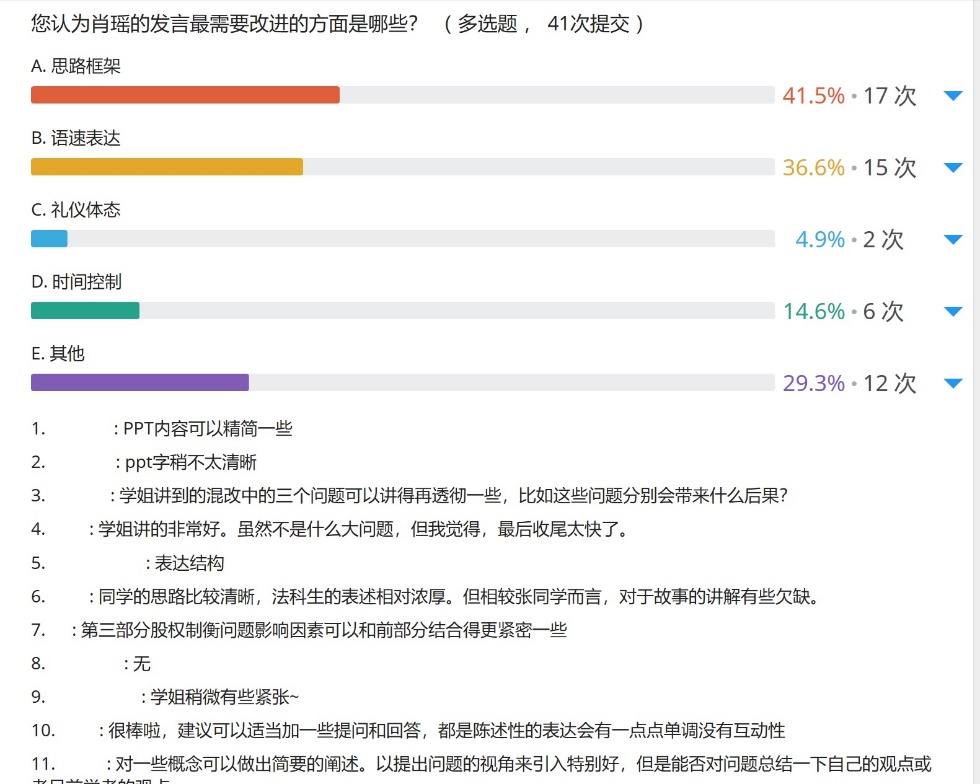 接着,2018级研究生黄申同学作为评议人,就三位发言人的发言内容进行了评议。黄申同学从总体上剖析了三位同学选题之间的联系,认为三位同学选题前后贯通环环相扣,令人受益良多。他评价谭舒予同学的展示结构清楚,内容翔实;张芃芊同学的表达流利,谈吐干练;肖遥同学台风沉稳,框架合理。对于谭舒予同学的发言内容,他阐明了自己对于战略投资者之间关联交易风险以及超额委派董事制度的看法。针对张芃芊同学的发言,他提出了国企混改自身特点是什么,以及民营企业有何种退出机制等问题。对于肖瑶同学的分享内容,他主要探讨了何为现金流权因素的问题。