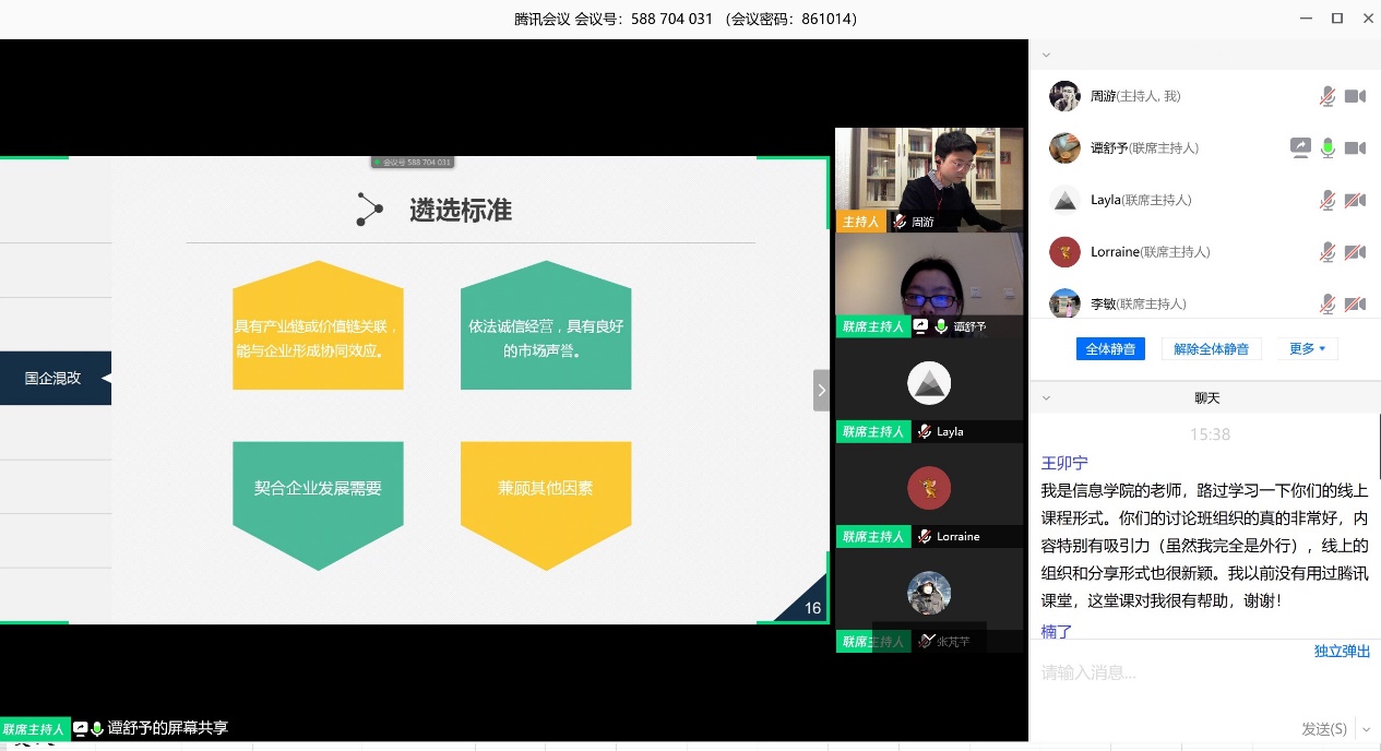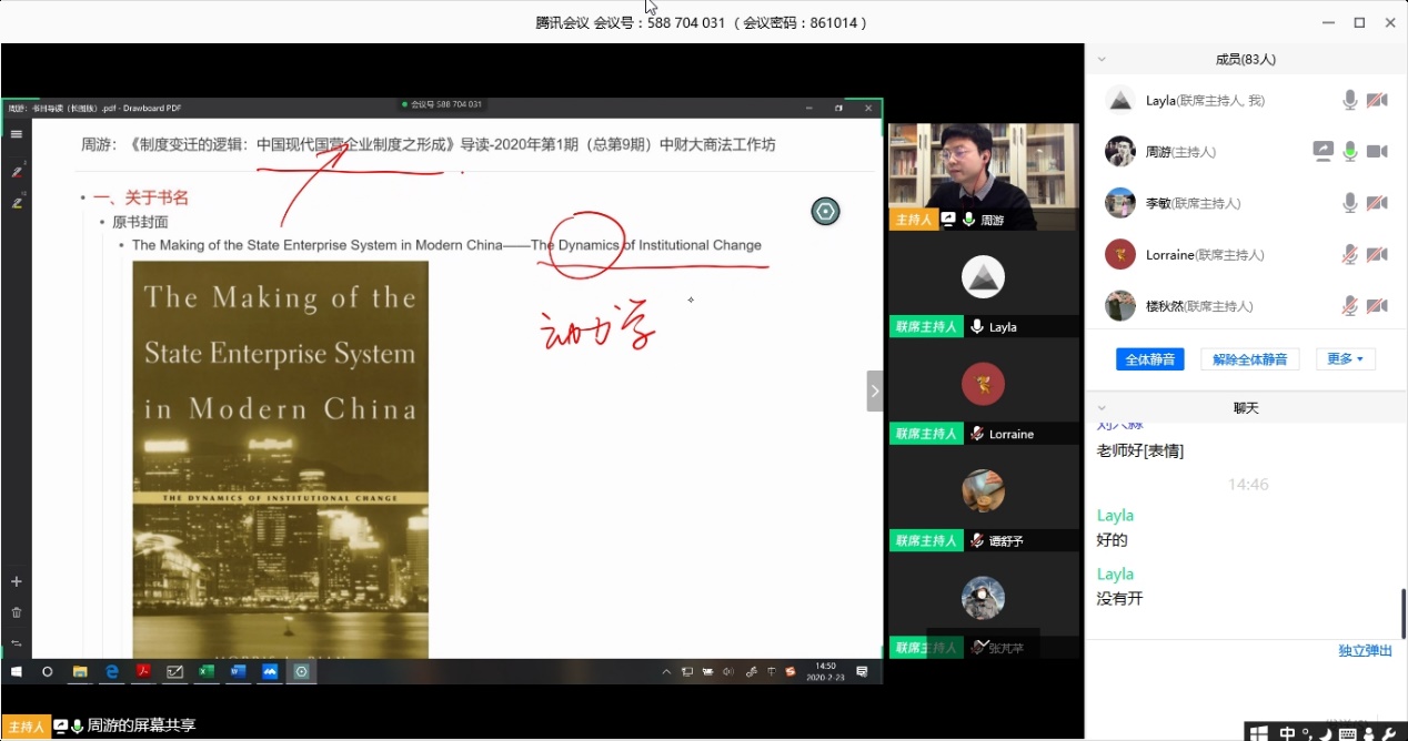 2月23日下午,商法工作坊2020年第1期(总第9期)在直播平台以线上交流与讨论的新方式举行。对外经济贸易大学mg4355vip检测中心讲师楼秋然博士、mg4355vip检测中心讲师李敏博士作为特邀嘉宾,mg4355vip检测中心商法教研室副主任周游副教授作为指导老师,与各位共同研读《制度变迁的逻辑——中国现代国营企业制度之形成》一书,并就“国企混改”议题展开讨论。工作坊主要由指导老师引导、发言人展示、成员及其他与会者提问及评价、评议人评议、特邀嘉宾发言、指导老师总结等环节组成。此次线上活动共有80余名校内外师生及业界人士参与讨论。