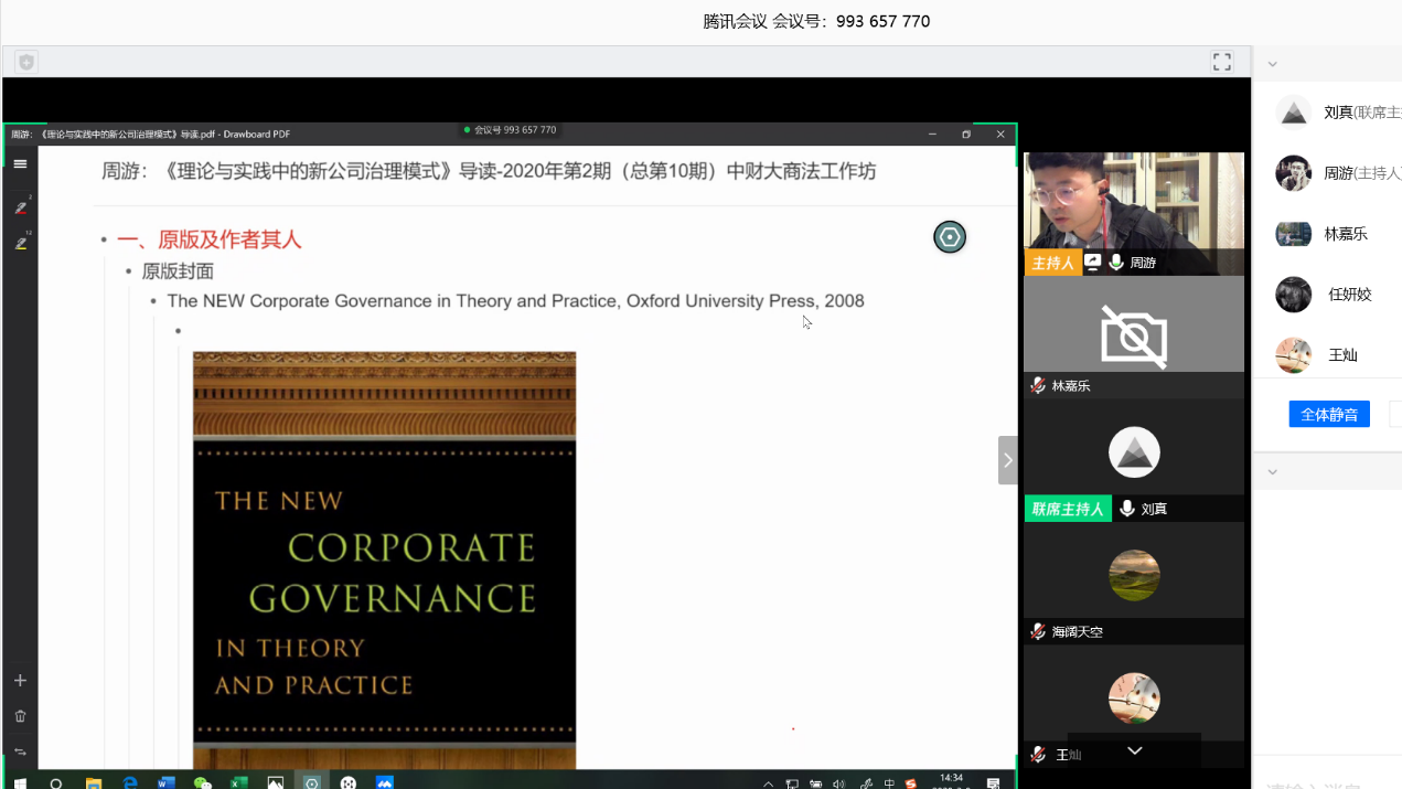 2020年3月8日下午,商法学研究工作坊本年度第2期(总第10期)在直播平台以线上交流与讨论的方式如期举行。此次活动旨在研读《理论与实践中的新公司治理模式》一书并探讨公司治理模式的相关法律问题。mg4355vip检测中心商法教研室副主任周游副教授作为指导老师参加了本次活动,活动主要由指导老师引导、发言人展示、成员及其他与会者提问及评价、评议人评议、特邀嘉宾发言、指导老师总结等环节组成。此次线上活动共有60余名校内外师生及业界人士参与讨论。