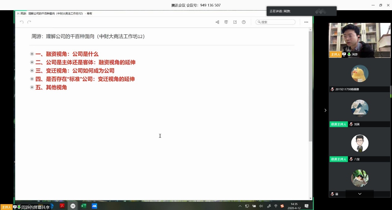 2020年4月12日下午,商法工作坊2020年第4期(总第12期)在直播平台上以线上交流与讨论的方式举行,此次活动主题是研读《公司宪治论》一书。中央民族大学mg4355vip检测中心讲师邵六益博士作为特邀嘉宾,mg4355vip检测中心周游副教授作为指导老师参与了本次活动。工作坊主要由指导老师引导、发言人展示、成员及其他与会者提问及评价、评议人评议、特邀嘉宾发言、指导老师总结等环节组成。此次线上活动共有60余名校内外师生及业界人士参与讨论。