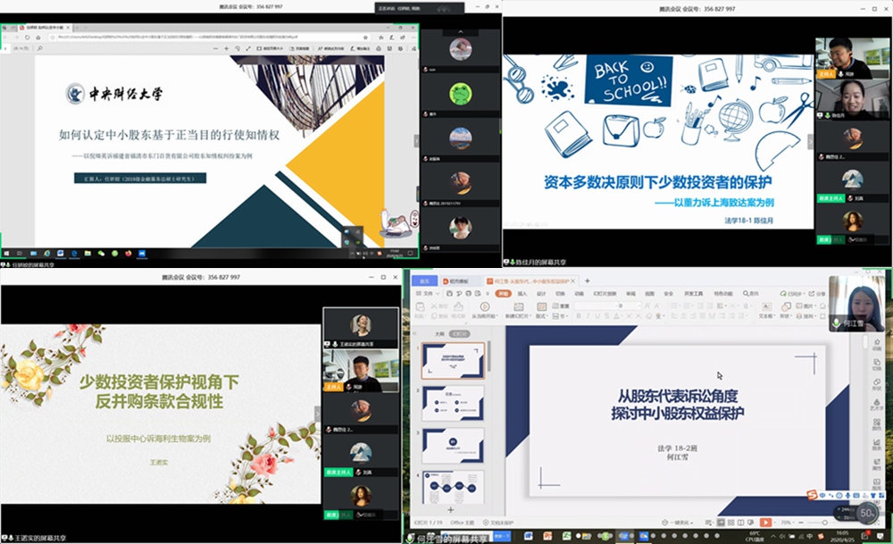 在发言人展示环节中,mg4355官网2019级研究生任妍姣以及2018级本科生陈佳月、何江雪,还有2018级中公财本科生王诺实分享了各自的研究体会。陈佳月同学以董力诉上海致达案为例,聚焦资本多数决原则下少数投资者的保护,具体分析救济途径,并提出了资本多数决原则下保护少数投资者的两点缓和办法。王诺实同学则通过万宝之争引入少数投资者保护视角下反并购条款合规性的话题,重点介绍了投服中心诉海利生物案,细数了目前应用于反并购的具体措施,提出对于反并购合规性空白领域的可行解决方案。任妍姣同学以倪瑞英诉福建省福清市东门百货有限公司股东知情权纠纷一案为切入点,探讨如何认定中小股东基于正当目的行使知情权的问题,详细归纳了股东知情权的行使方式、内容范围与程序条件以及“正当目的”的认定。何江雪同学从江西省首例股东代表诉讼案入手,从股东代表诉讼角度探讨中小股东的权益保护,结合世行营商环境评价指标,分析保护中小投资者的必要性,总结股东代表诉讼的制度功能,并延伸提出了完善建议。